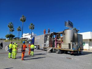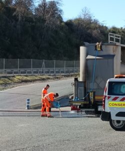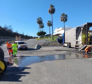 A continuación, en las instalaciones de Autopista del Sol se realizó un simulacro de derrame de gasoil, originado por una fuga en el depósito de combustible de un vehículo pesado. Este ejercicio permitió evaluar la aplicación de los protocolos de contención, limpieza y coordinación entre los equipos de emergencia. El personal puso en práctica todo el procedimiento de gestión de la incidencia, desde la contención del vertido hasta la restitución ambiental de la zona afectada, siguiendo las directrices establecidas en el Plan de Autoprotección de AUSOL.