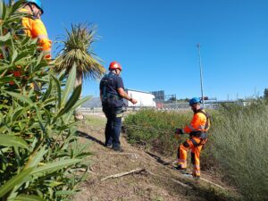 Ambas sesiones comenzaron con un curso especializado en trabajos en altura y técnicas de rescate, de carácter teórico-práctico. La formación se centró en el uso seguro de líneas de vida y sistemas anticaídas, entre otros equipos de protección, así como en maniobras de evacuación y actuación ante situaciones de riesgo. Impartida por instructores acreditados, la sesión incluyó ejercicios prácticos en escenarios reales de trabajo, lo que permitió asegurar que los trabajadores puedan intervenir con eficacia y seguridad en zonas elevadas, de difícil acceso o con pendiente pronunciada